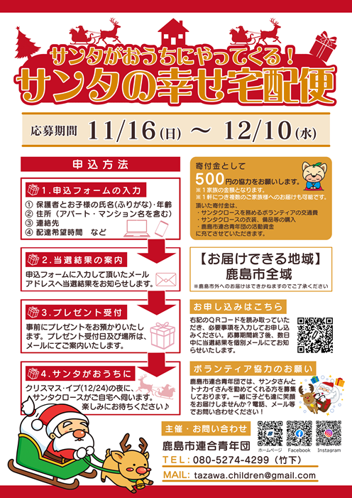 鹿島市連合青年団では、プレゼントを配達するボランティアスタッフを募集しています。